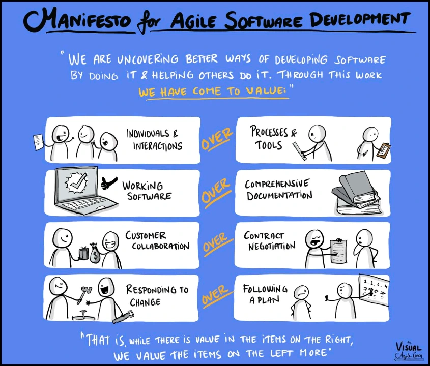 De esta reunión, los 17 asistentes resumieron los principios sobre los que se basan los métodos alternativos en los que estaban trabajando, y la esencia de esto quedó definida en 4 valores y 12 principios: Lo que ha quedado denominado como Manifiesto Ágil.