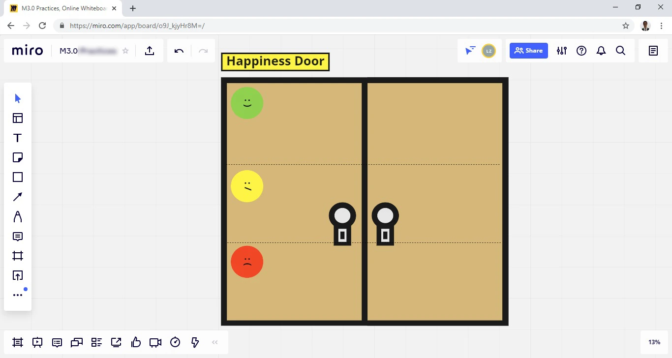 A pesar de estar trabajando de manera distribuida, en equipo de trabajo estuvimos manteniendo algunas sesiones realizando diversas prácticas de Management 3.0, y a pesar de que en general el equipo se ha mostrado emocionado al respecto, no estoy seguro de que todas las personas en el equipo se sientan convencidas y que les haya gustado la sesión, es por esto que se necesita obtener retroalimentación en tiempo real de qué es pareció, para de esta manera poder mejorar las sesiones. Es por esto por lo que decidí aplicar Happiness Door después de una sesión, tal como lo recomienda Jurgen Appelo, para conocer el sentir del equipo sobre las sesiones de Management 3.0 que hemos tenido, lo que les ha gustado, lo que no les ha gustado del todo, y lo que definitivamente no les ha gustado que se debería mejorar.