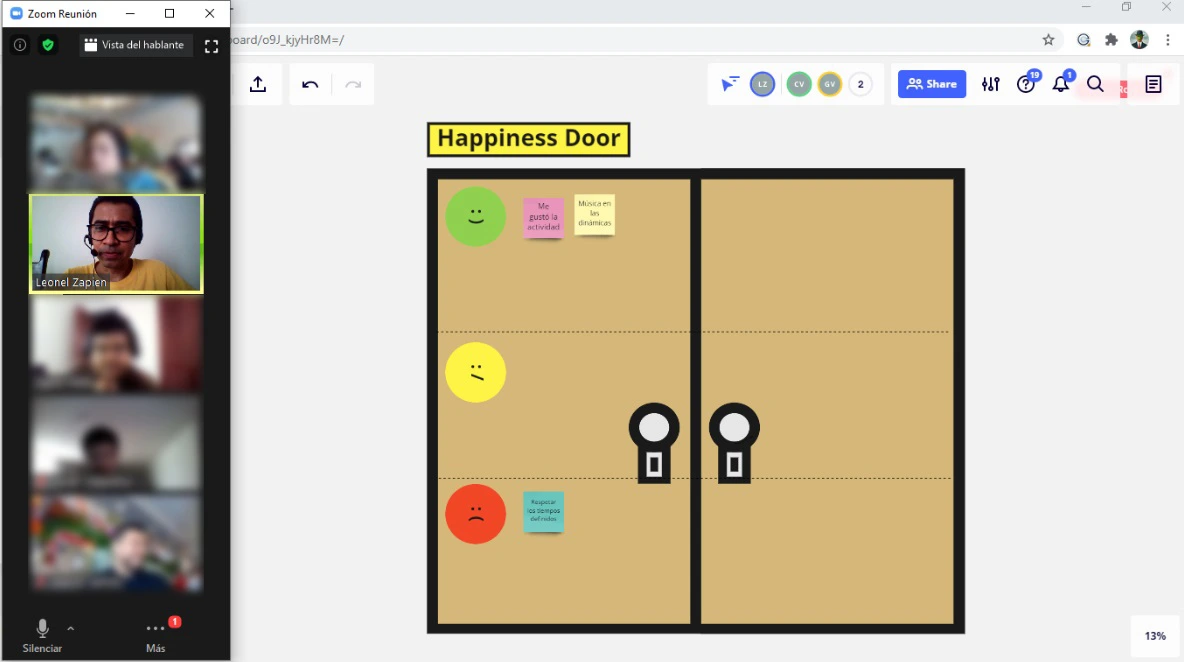 En el tablero inicial en miro, se dividió una puerta en 3 secciones, una para cada uno de los emojis, para que los integrantes del equipo pusieran sus notas en cada sección según como se sintieran.