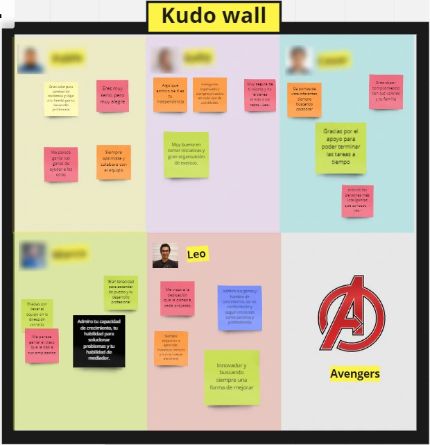 - Timebox de 3 minutos para que cada integrante lea cada uno de sus kudos, uno a la vez, y la persona que se lo escribió indica que él o ella lo escribió y colocó en la pared virtual.