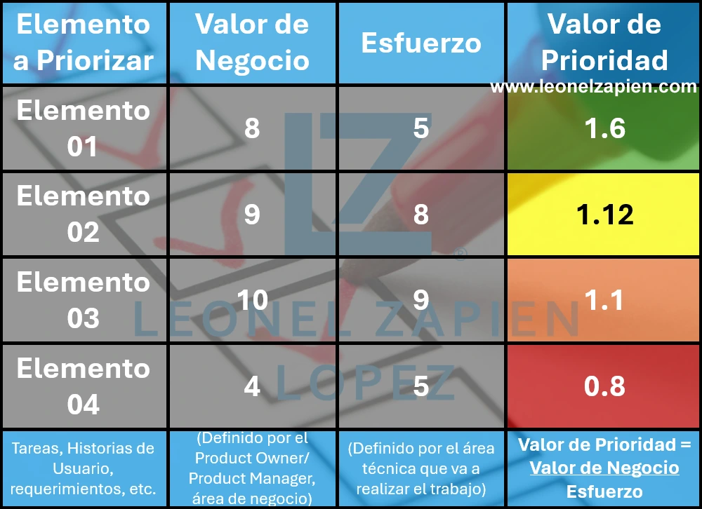 Valor de Prioridad = Valor de Negocio / Esfuerzo