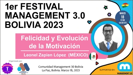Webinar que tuve el gusto de compartir el 18 de marzo de 2023 para el 1er Festival de Management 3.0 de Bolivia 2023, conmemorando el "Día Internacional de la Felicidad" (en el contexto del video, hablo sobre los motivadores que promueven la felicidad en el trabajo).